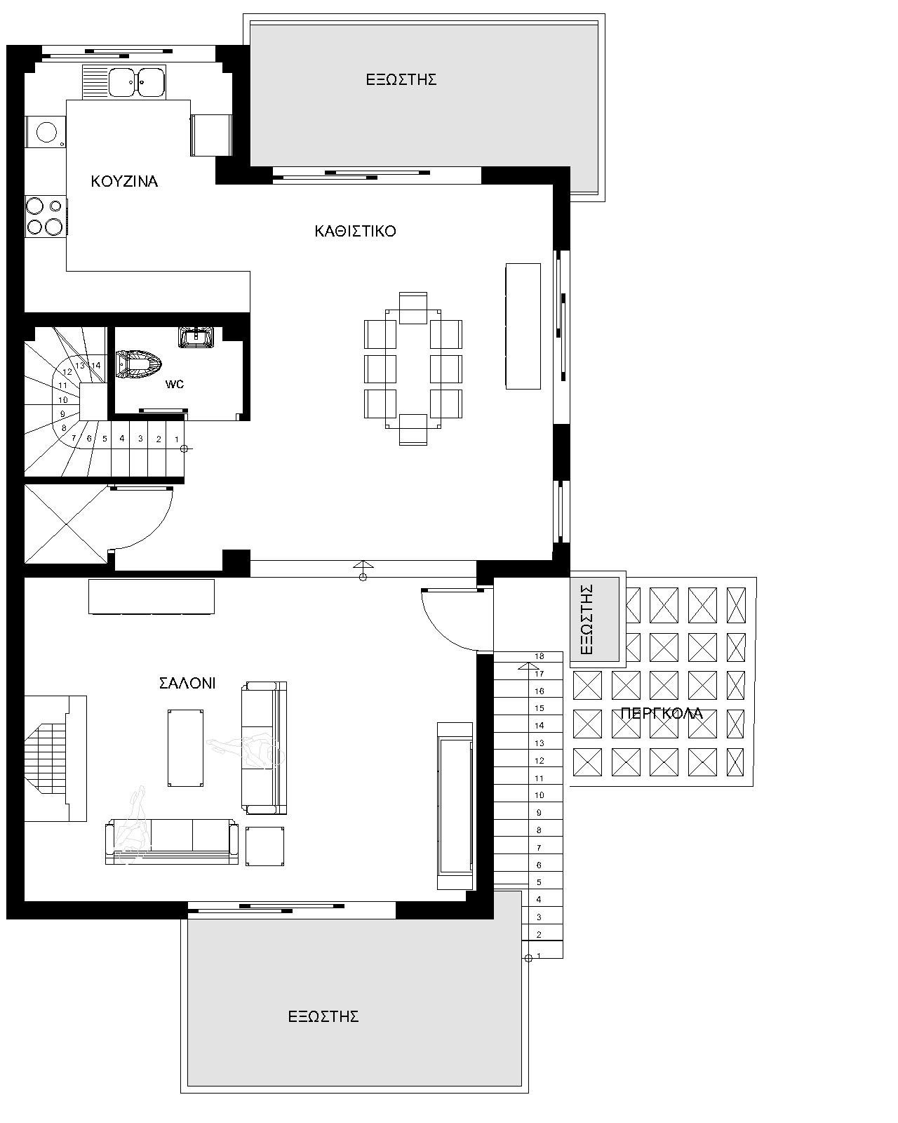 Η μεζονέτα αποτελείται από τους χώρους διημέρευσης στον πρώτο όροφο, δηλαδή, το καθιστικό , την τραπεζαρία και την κουζίνα ενώ τα υπνοδωμάτια και το καθημερινό αναπτύσσονται στους υπόλοιπους ορόφους επιτυγχάνοντας την δυνατότητα της απομόνωσης.Η δημιουργία αίθριου διασφαλίζει την επικοινωνία και την λειτουργικότητα των ορόφων. Η οπή στον εξώστη δημιουργεί έναν πρωτότυπο διάλογο ανάμεσα στην αρχιτεκτονική και το τοπίο ,σεβόμενη την διαχρονικότητα της φύσης. Τέλος, η επιλογή εξωτερικής θερμομόνωσης σε συνδυασμό με την ενδοδαπέδια θέρμανση επιτυγχάνει θερμική άνεση στους εσωτερικούς χώρους του κτιρίου.