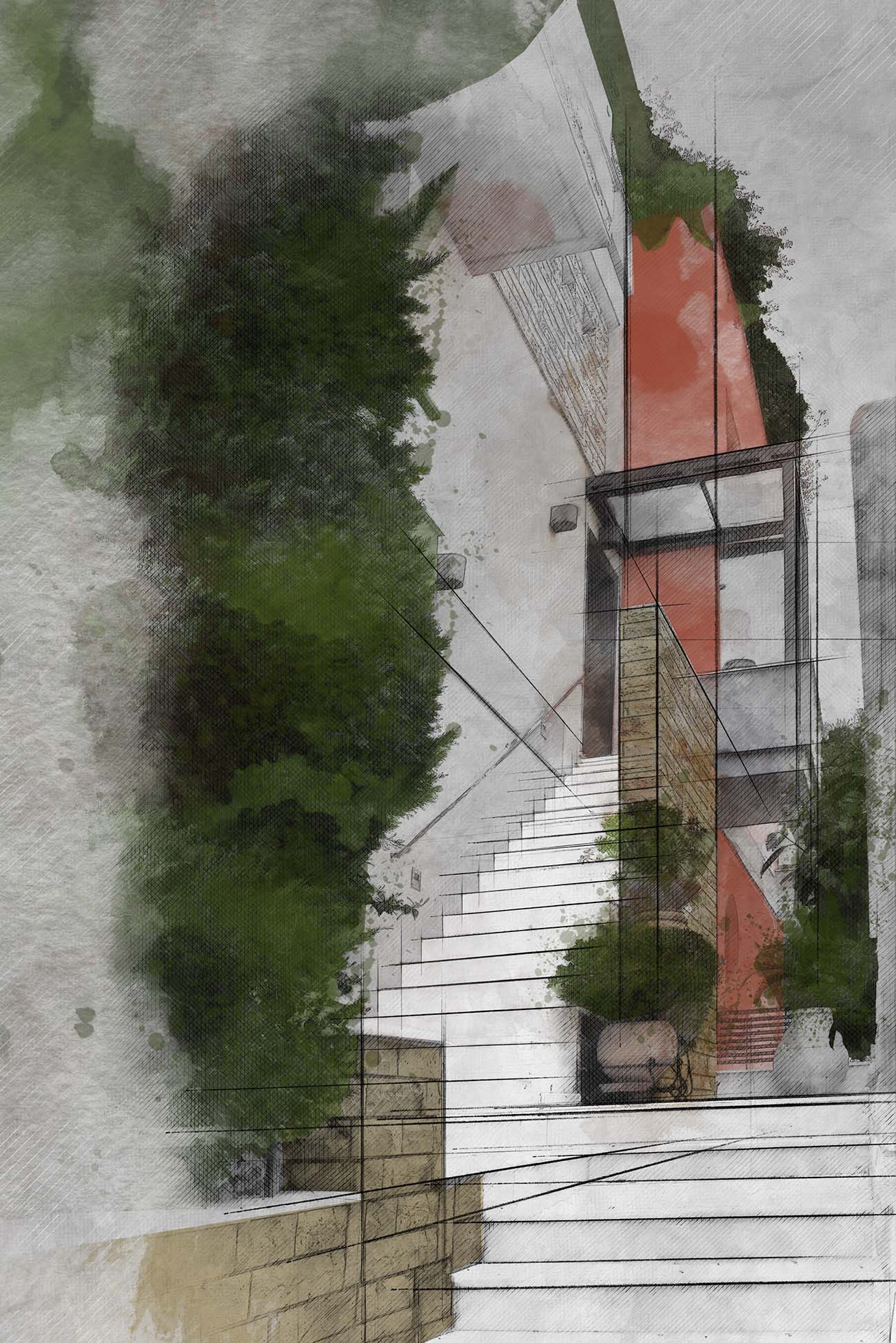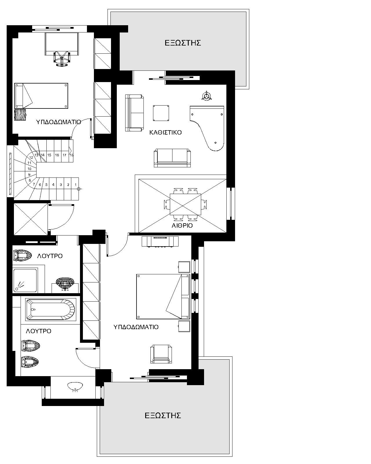 Η διπλοκατοικία βρίσκεται στο Χαϊδάρι σε ένα μεσαίο οικόπεδο με ήπια κλίση και διαρθρώνεται σε ένα οροφοδιαμέρισμα και μία μεζονέτα τριών επιπέδων.