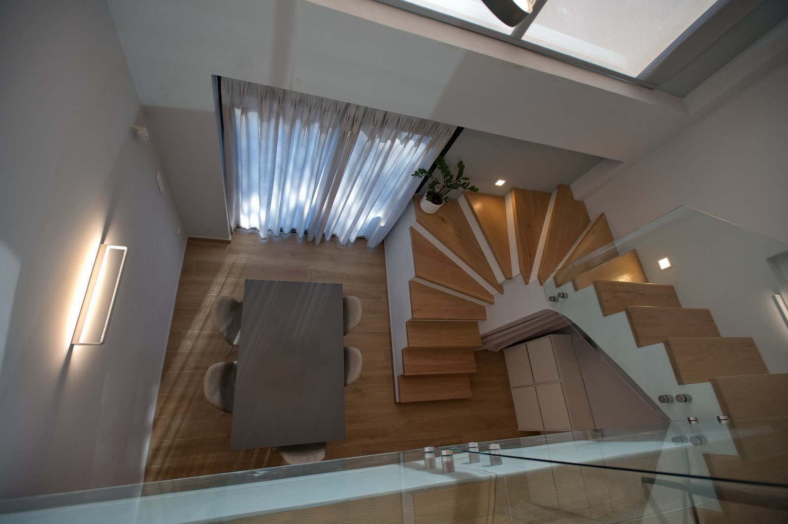 Έτσι, το κτίριο τοποθετείται στο κέντρο του οικοπέδου(πανταχόθεν ελεύθερο)   με αποτέλεσμα να μην έρχεται σε επαφή με τα όμορα κτίσματα δημιουργώντας διαμπερή διαμερίσματα. Το κτίριο αναπτύσσεται σε πέντε επίπεδα, το υπόγειο όπου αναπτύσσονται χώροι βοηθητικής χρήσης και θέσεων στάθμευσης, το ισόγειο όπου αποτελείται από τρία διαμερίσματα, ο πρώτος όροφος  από δύο διαμερίσματα ,ο δεύτερος από δύο μεζόνέτες. Το κεντρικό κλιμακοστάσιο τοποθετείται στο κέντρο του οικοπέδου διαχωρίζοντας το κτίριο σε δύο όγκους με αποτέλεσμα οι κατοικίες να θεωρούνται  οροφοδιαμερίσματα  με την μέγιστη ιδιωτικότητα τους. Τέλος, στον δεύτερο όροφο αναπτύσσονται τα διαμερίσματα ως μεζονέτες με εσωτερικούς εξώστες (πατάρια) με στέγη.