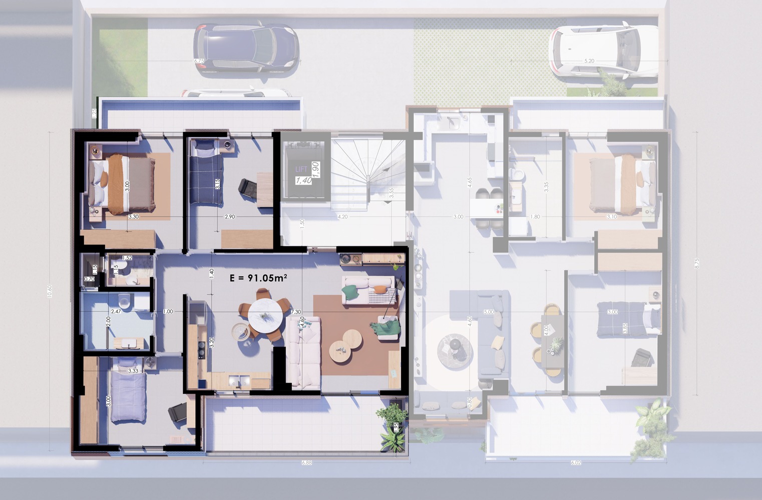Βρίσκονται στον 2ο και 3ο όροφο, με εμβαδόν 91,05 τ.μ.