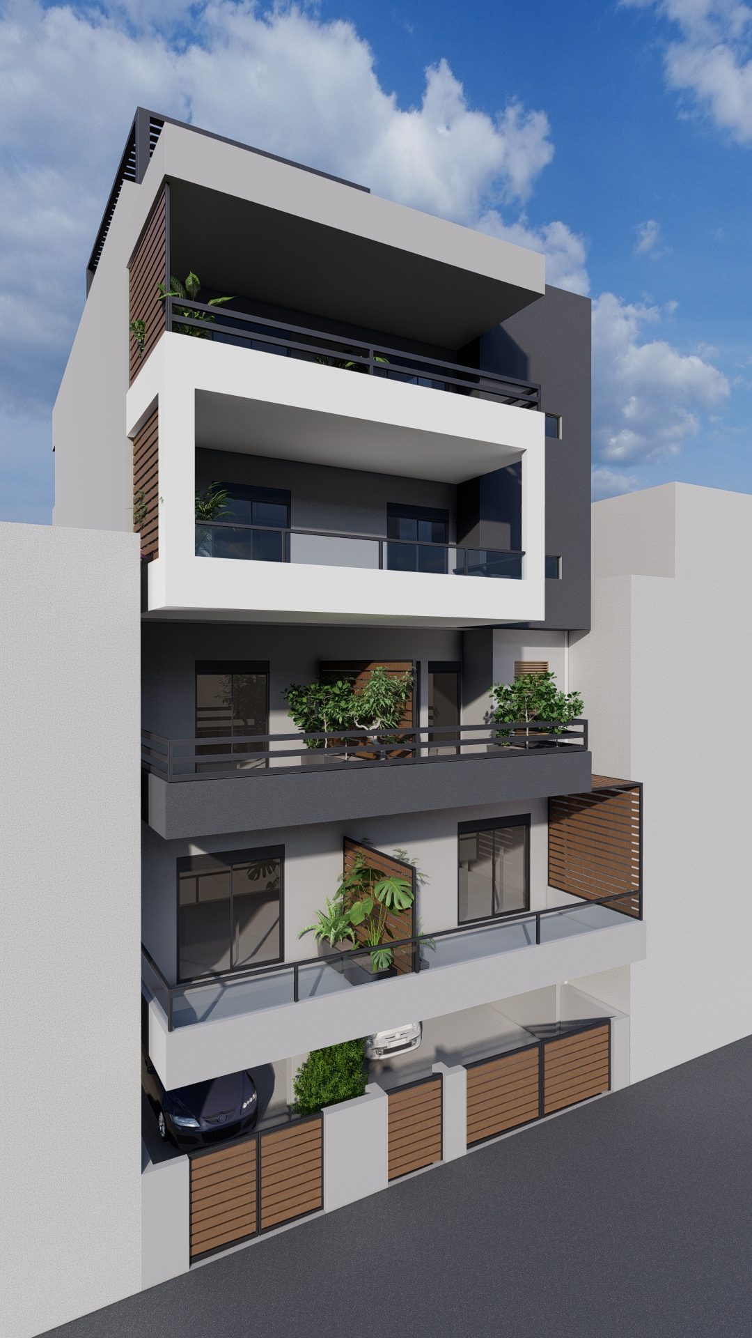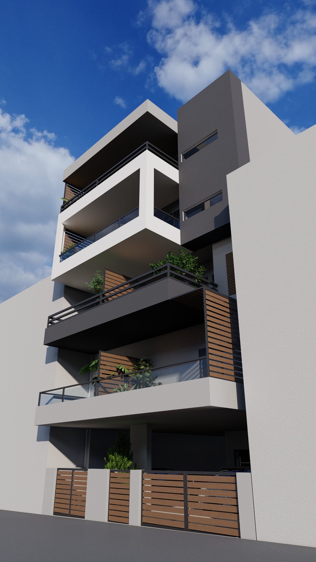 Στόχος της μελέτης είναι η μέγιστη εκμετάλλευση της δόμησης του οικοπέδου ,δημιουργώντας δύο μαιζονέτες με εσωτερικούς εξώστες και δύο οροφοδιαμερίσματα στους τελευταίους ορόφους. Οι ανοιχτοί εξώστες οι οποίοι αναπτύσσονται στην μπροστινή όψη του κτιρίου, δημιουργούν ένα παιχνίδι όγκων και διαμορφώνουν την εικόνα της οικοδομής.Όσον αφορά την ισόγεια στάθμη ,αυτή αποτελείται από τους χώρους στάθμευσης και τους κοινόχρηστους χώροι της εισόδου ενώ στο υπόγειο διατάσσονται οι βοηθητικοί χώροι αποθηκών.